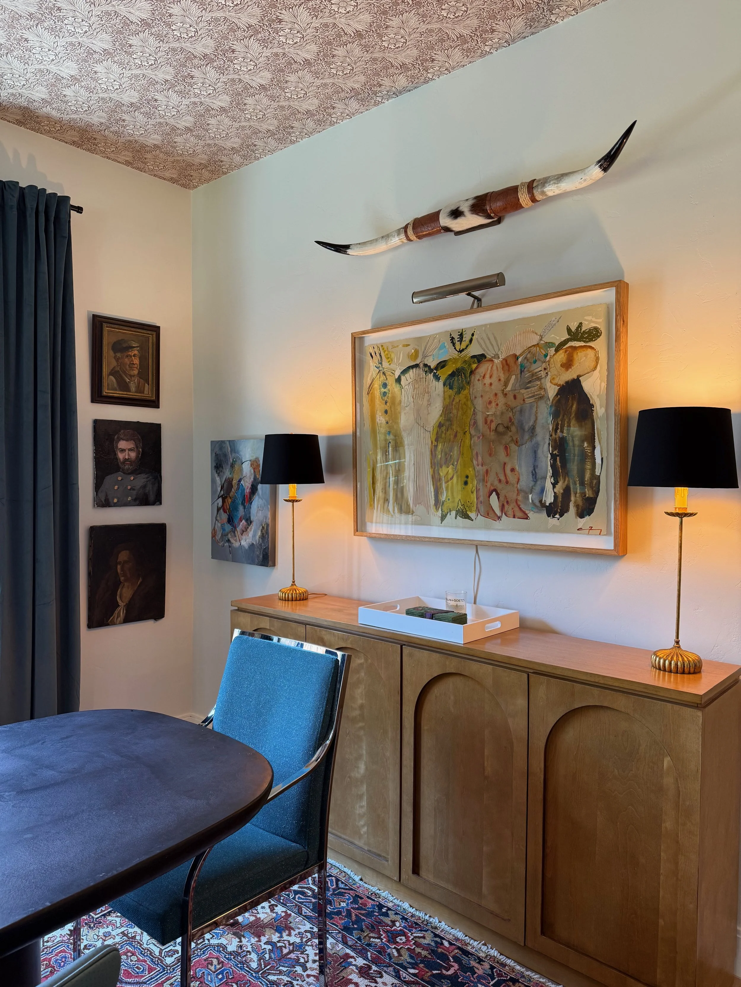 My appreciation for art is a cornerstone of Collected West, and in this dining room, it truly takes center stage. What adorns these walls isn't a pre-selected gallery; it's a dynamic collection that has grown as we've encountered pieces that genuinely resonate. This approach highlights the power of building a personal gallery driven by passion, not simply by what "matches."